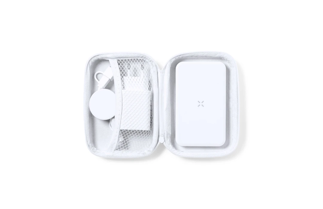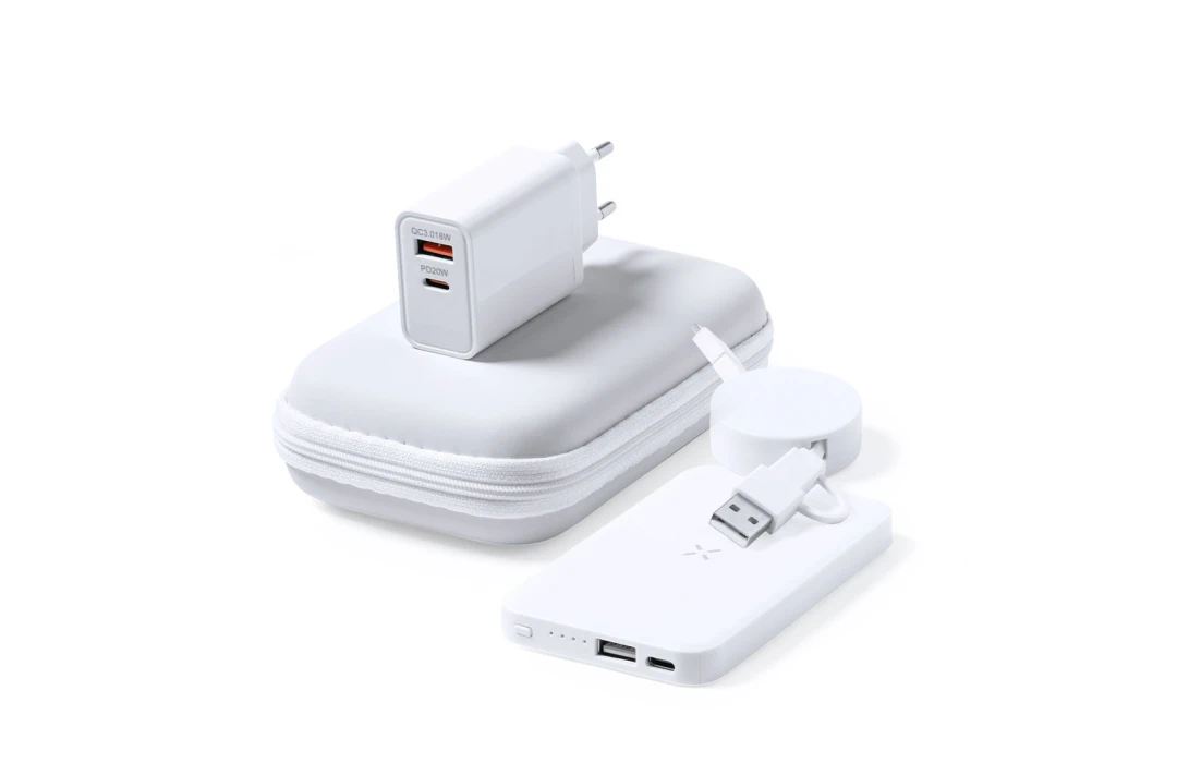 Le set inclut un chargeur mural 220V à double sortie, avec une sortie USB QC 3.0 (charge rapide) de 18W et une sortie de type C de 20W, dotée de la technologie de charge rapide PD (Power Delivery), garantissant une compatibilité étendue avec divers appareils. Présenté dans un étui rigide en similicuir avec fermeture à glissière et finition mate, l'intérieur est rembourré et comporte des compartiments avec poches en filet pour un rangement organisé et sécurisé.
