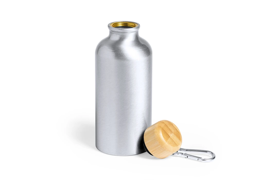 Gourde personnalisée en alu mat bouchon bambou et mousqueton Yorix 400 ml