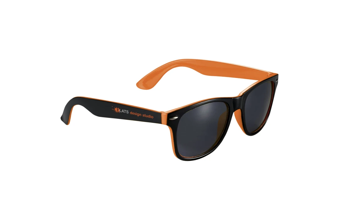 Optez pour les lunettes de soleil publicitaires rétro bicolores Sun Ray personnalisables pour marquer les esprits lors de vos événements promotionnels ou comme cadeaux d'entreprise uniques. Ces lunettes de soleil au design rétro et élégant offrent une finition intérieure de couleur flashy, ajoutant une touche moderne et distinctive. Les verres teintés noir de catégorie 3 assurent une protection optimale contre le soleil, conformément à la norme EN ISO 12312-1 et à la protection UV 400, garantissant ainsi sécurité et confort pour les yeux.