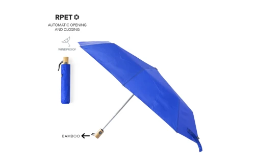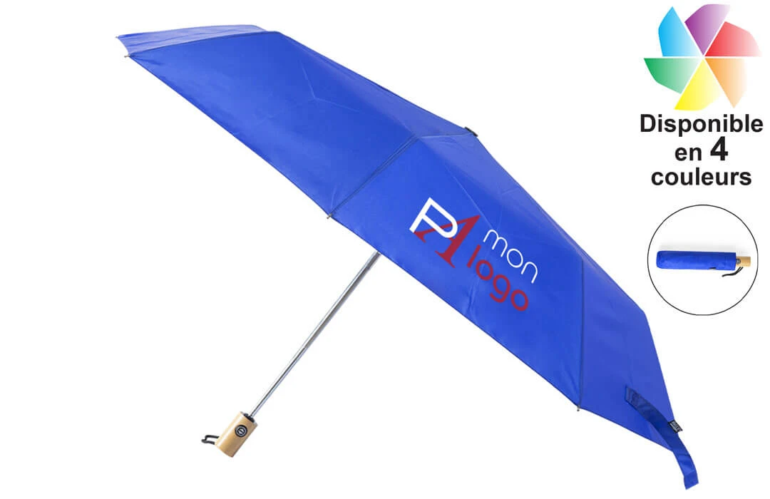 Le matériau en pongee 190T utilisé pour le parapluie est fabriqué à partir de plastique recyclé, garantissant une démarche écologique respectueuse de l'environnement. L'ouverture et la fermeture automatiques ajoutent une praticité indispensable, tandis que le mécanisme anti-vent et les tiges en fibre de verre assurent une robustesse et une résistance aux intempéries. La poignée en bambou avec bouton et le badge RPET sur l’étiquette soulignent le caractère écologique de ce produit.