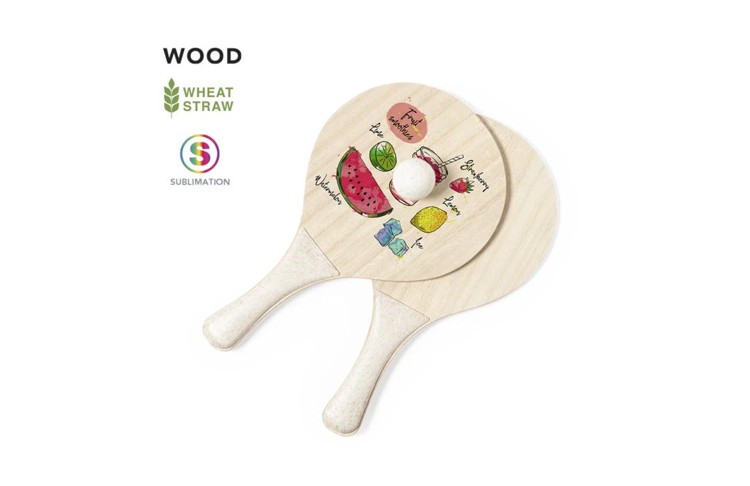 Découvrez ce jeu de raquette de plage publicitaire personnalisée "Zaxia" écoresponsable spécilament conçu pour la personnalisation en sublimation, une solution publicitaire parfaite qui combine respect de l'environnement et personnalisation avancée comme la photo. Fabriquée en bois et dotée d'une poignée renforcée en fibre de canne de blé, ce jeu de raquette de plage publicitaire est non seulement durable mais aussi respectueuse de l'environnement grâce à l'utilisation de matériaux naturels qui réduisent les émissions polluantes.