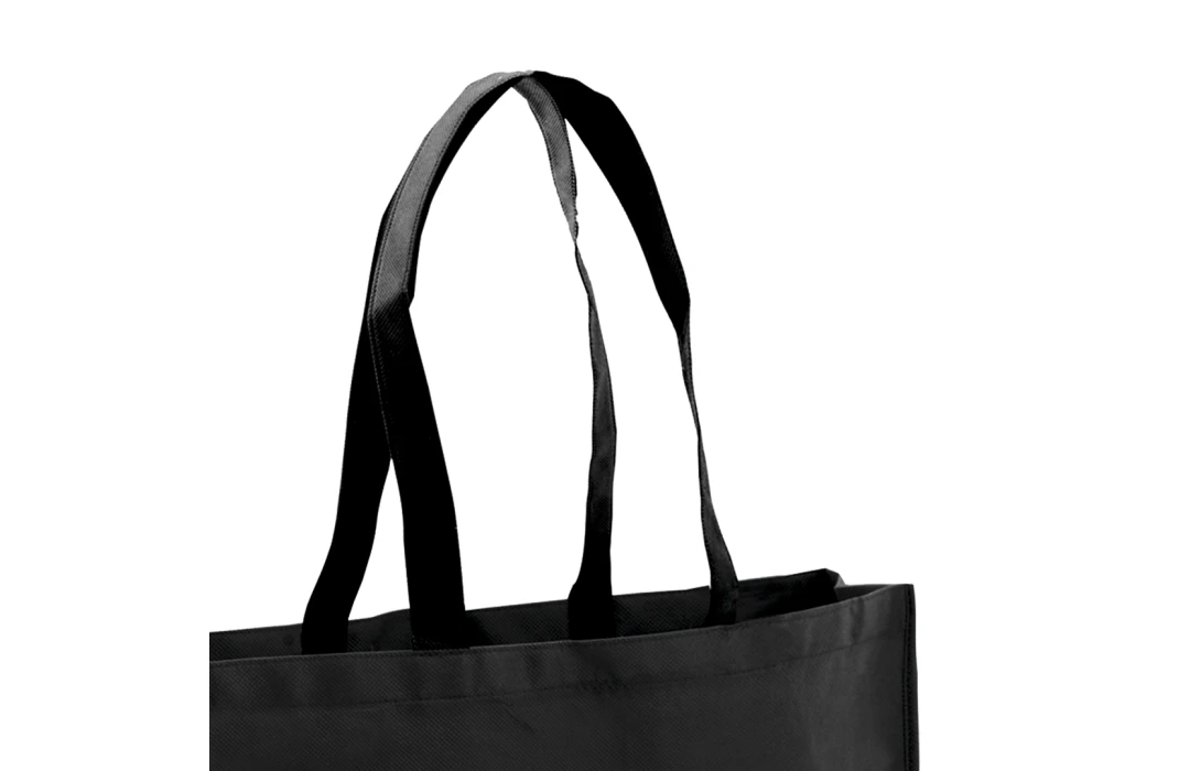 Le sac Tucson mesure 40 cm de longueur, 32 cm de hauteur et 11 cm de largeur, ce qui en fait un format idéal pour les courses, les événements ou les salons. Ses grandes anses de 70 cm, de couleur noire, assurent un confort optimal pour un port à l'épaule ou à la main, même lorsque le sac est bien rempli. Le soufflet renforcé par passepoil et la finition cousue ajoutent une touche de solidité supplémentaire, garantissant une longue durée de vie à ce sac publicitaire.