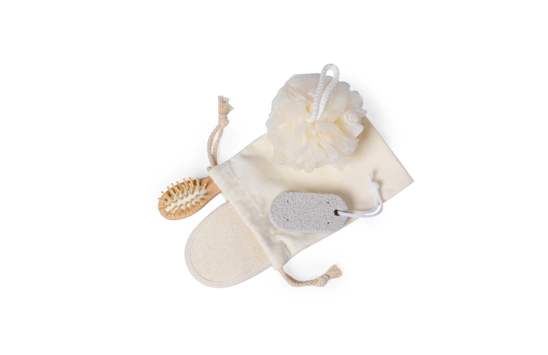 Le kit comprend une brosse à cheveux en bois doux avec des poils assortis, parfaite pour démêler et lisser les cheveux sans les abîmer. L'éponge souple incluse est idéale pour un nettoyage doux et agréable de la peau, tandis que l'éponge exfoliante, adaptable à la paume de la main, permet de retirer efficacement les cellules mortes, laissant la peau lisse et revitalisée. Enfin, la pierre ponce incluse est parfaite pour adoucir les pieds et éliminer les callosités, pour une sensation de douceur et de confort prolongée.